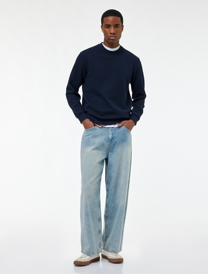 Regular Fit Uzun Kollu Dokulu Basic Bisiklet Yaka Sweatshirt
