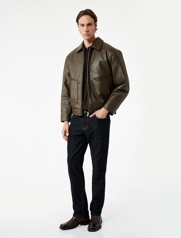 Slim Fit Uzun Kollu Fermuarlı Gömlek Yaka Suni Deri Ceket Sepete Ekle
