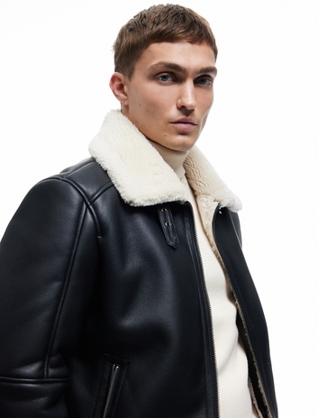 Uzun Kollu Cep Detaylı Fermuarlı Peluş Yaka Suni Deri Ceket Sepete Ekle