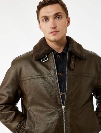 Peluş Yaka Cep Detaylı Uzun Kollu Fermuarlı Suni Deri Ceket Sepete Ekle