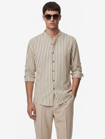 Keten Viskon Karışımlı Regular Fit Düğmeli Uzun Kollu Çizgili Hakim Yaka Gömlek Sepete Ekle