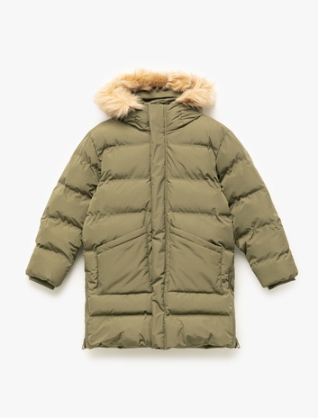 Peluş Detaylı Uzun Kollu Fermuarlı Cepli Uzun Kapşonlu Şişme Mont Sepete Ekle