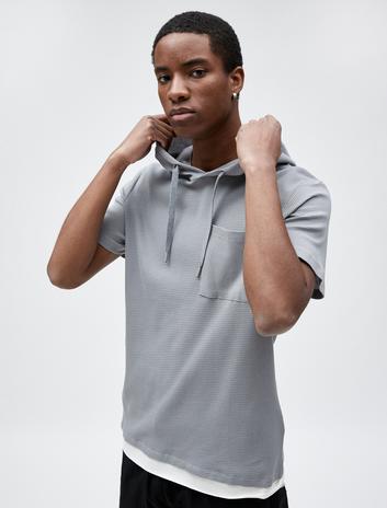 Basic Kapşonlu Tişört Kısa Kollu Dokulu Cep Detaylı Pamuklu