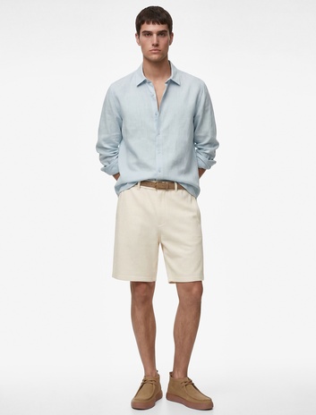 Regular Fit Uzun Kollu Düğmeli Hakim Yaka Keten Gömlek