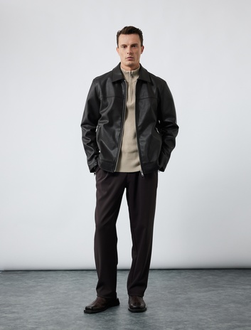 Uzun Kollu Fermuarlı Cep Detaylı Gömlek Yaka Suni Deri Ceket Sepete Ekle