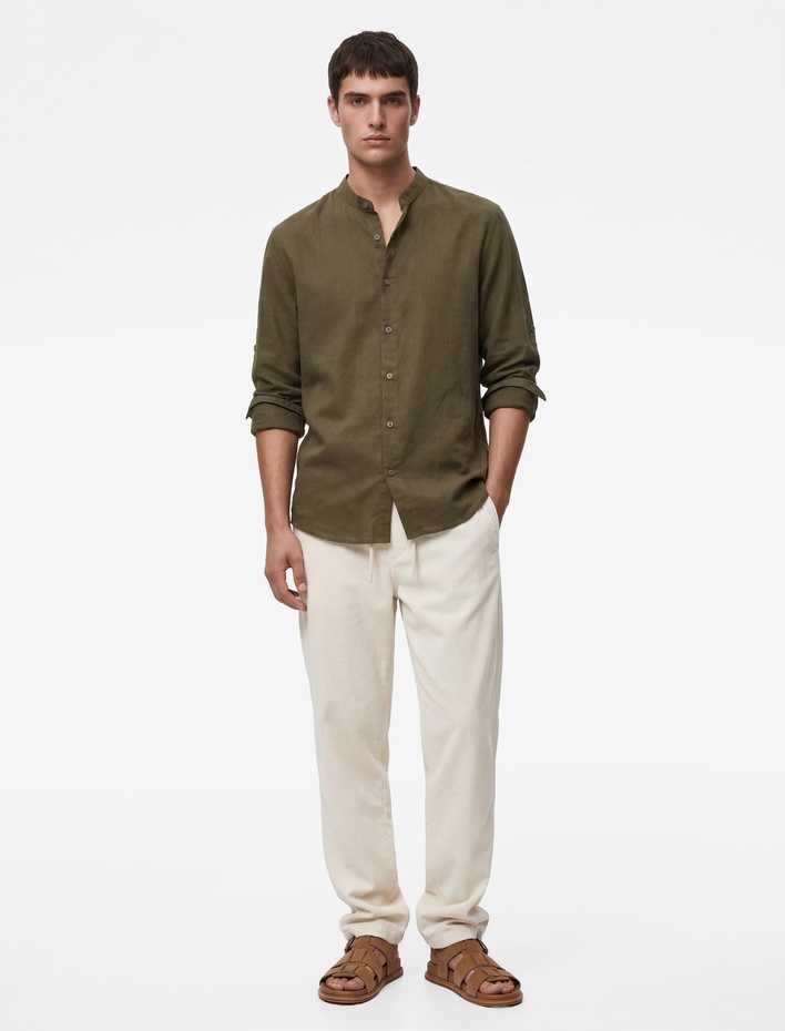 Regular Fit Düğmeli Yaka Uzun Kollu Keten Gömlek