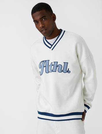 Kolej İşlemeli Oversize Sweatshirt Şardonlu V Yaka