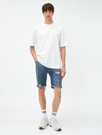 Bermuda Yırtık Kot Şort Katlama Detaylı Düğmeli Cepli Sepete Ekle
