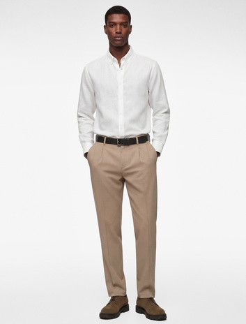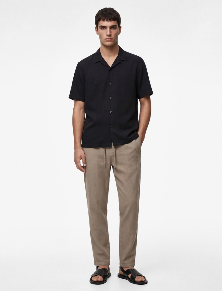 Regular Fit Düğmeli Yaka Uzun Kollu Keten Gömlek