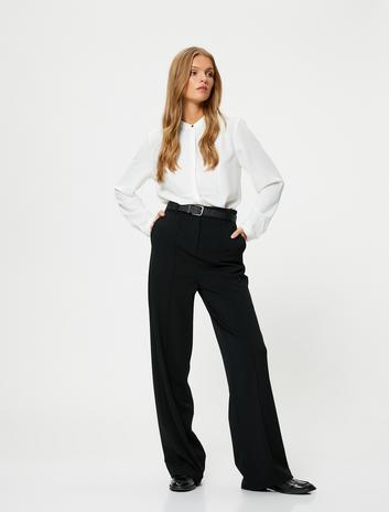 Geniş Paça Kumaş Pantolon Yüksek Bel Rahat Kalıp Nervür Detaylı Cepli