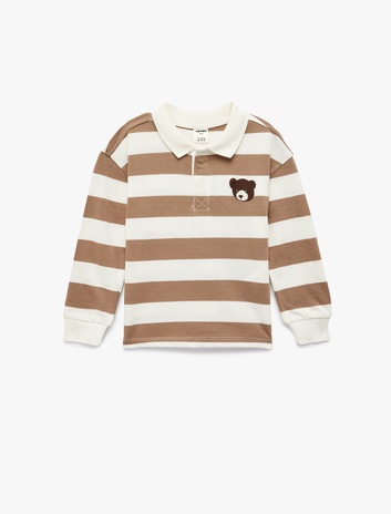 Pamuklu Ayıcık Nakış Detaylı Uzun Kollu Polo Yaka Çizgili Sweatshirt Sepete Ekle
