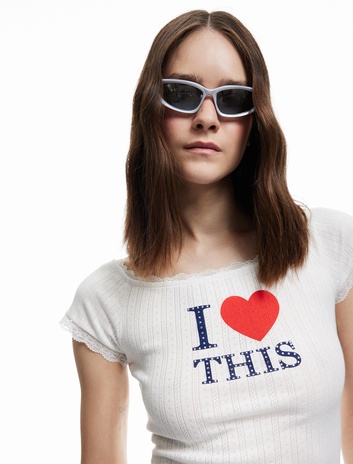 Dantel Detaylı Pamuklu Slim Fit Baskılı Omzu Açık Tişört