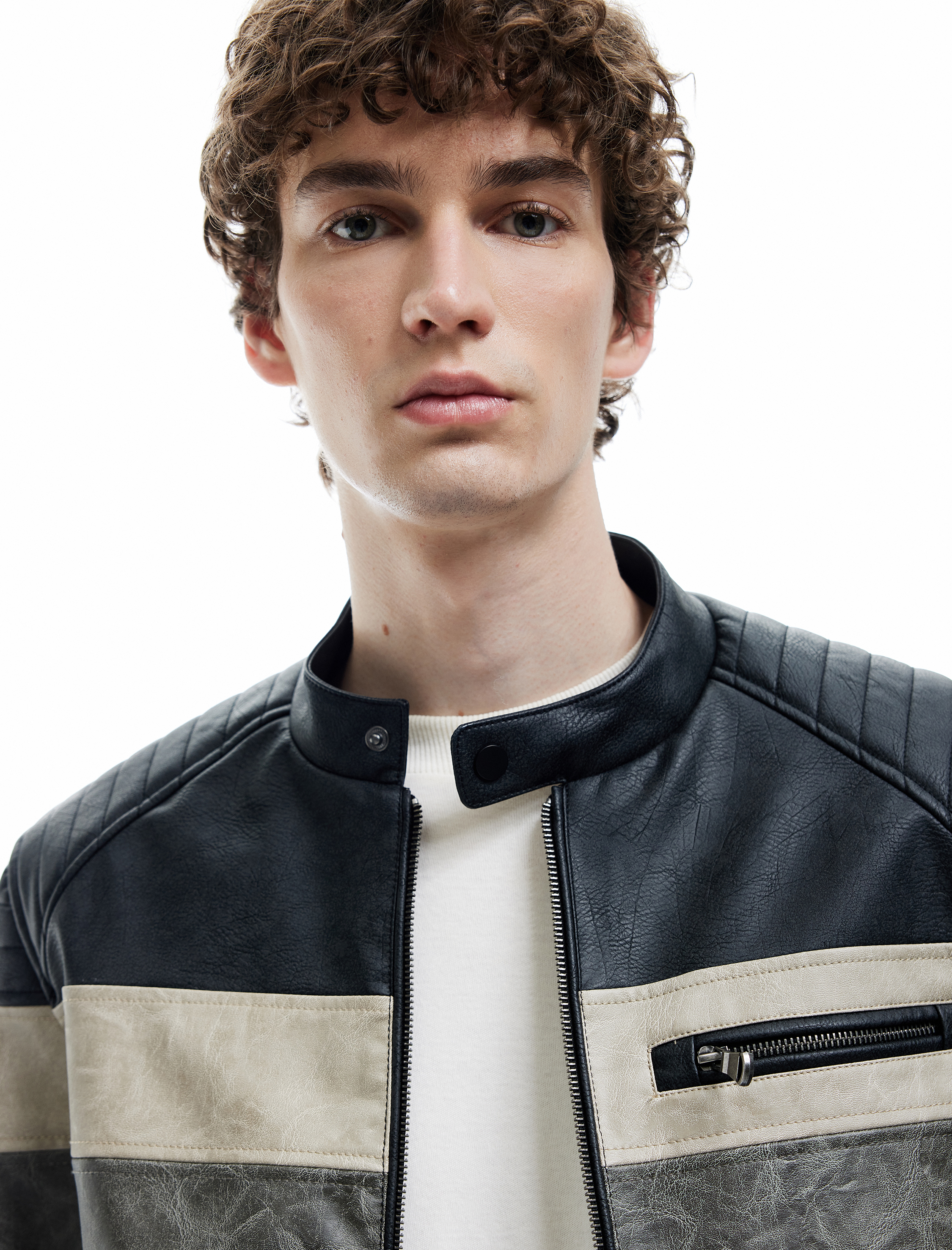 Renk bloklu, fermuar detaylı, cepli, hakim yaka, uzun kollu deri ceket.