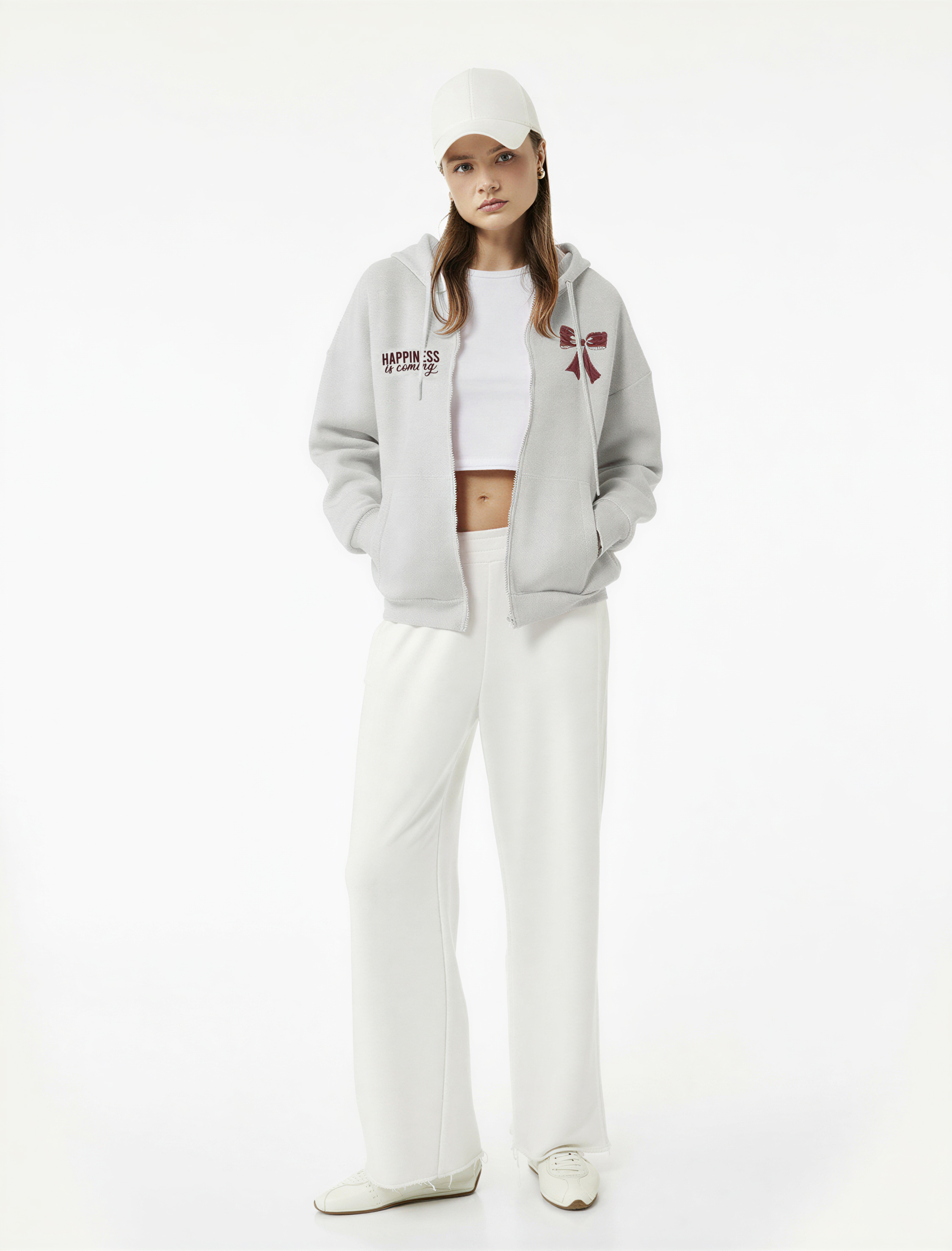 Fermuarlı Kapüşonlu Kanguru Cep Detaylı Arkası Fiyonk Baskılı Şardonlu Oversize Sweatshirt