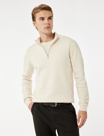 Uzun Kollu Viskon Karışımlı Yarım Fermuarlı Triko Kazak