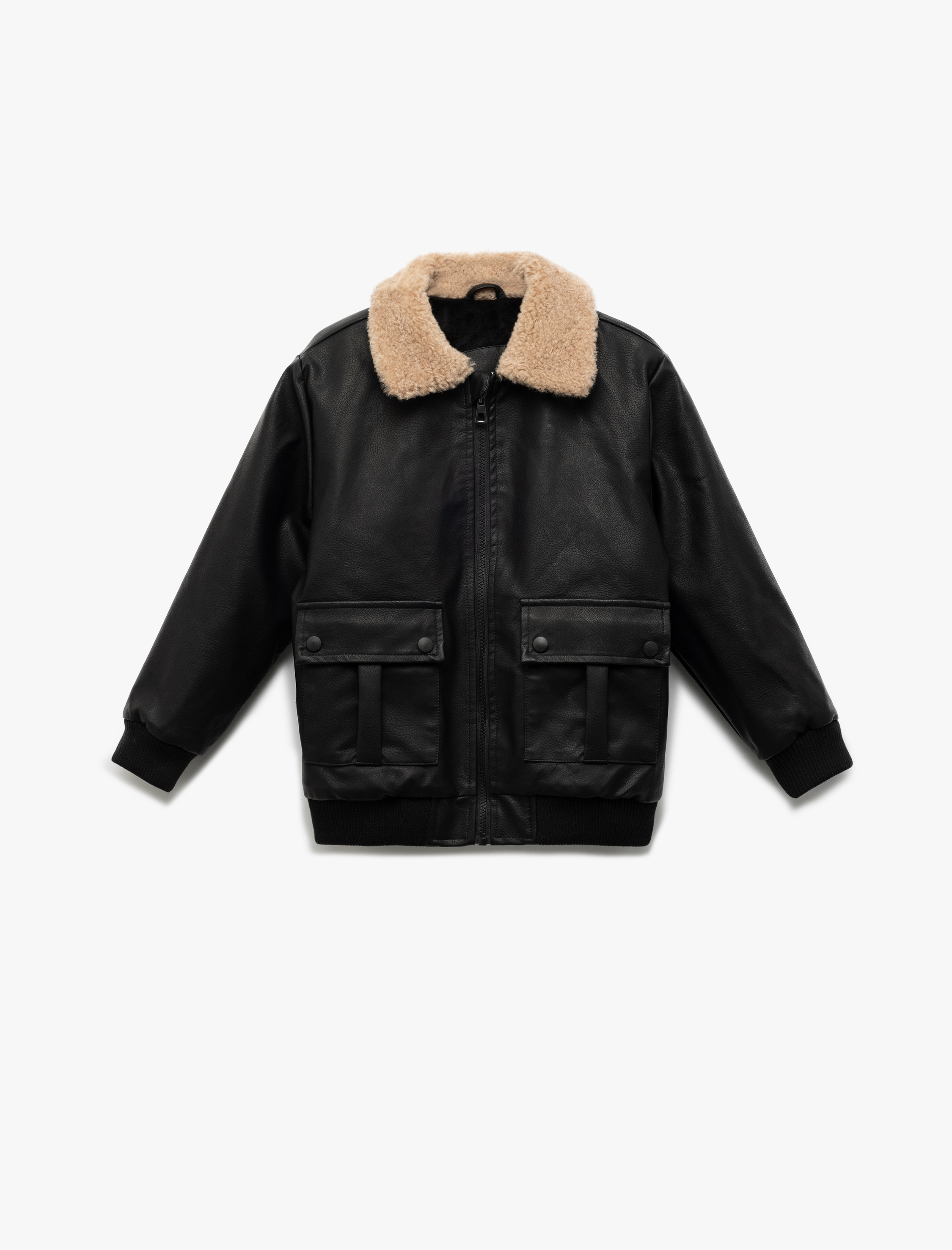 Erkek Çocuk Fermuarlı Peluş Yaka Cepli Bomber Deri Ceket