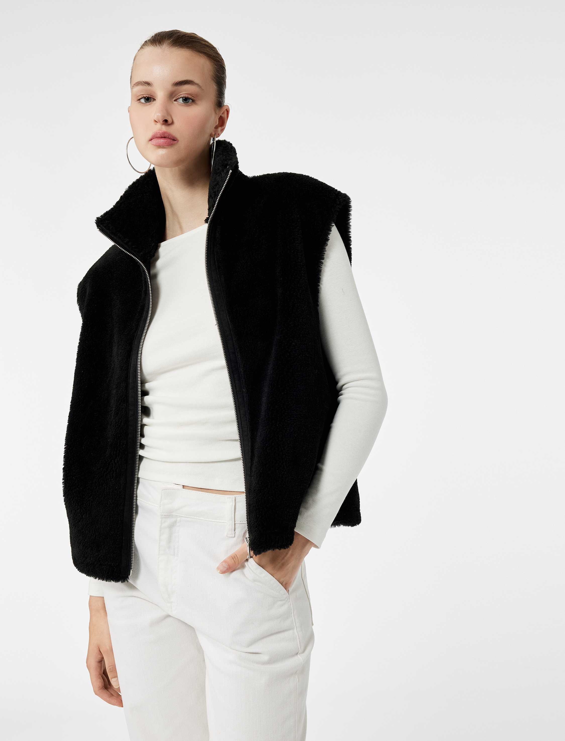 Fermuarlı Uzun Şal Yaka Peluş Yelek