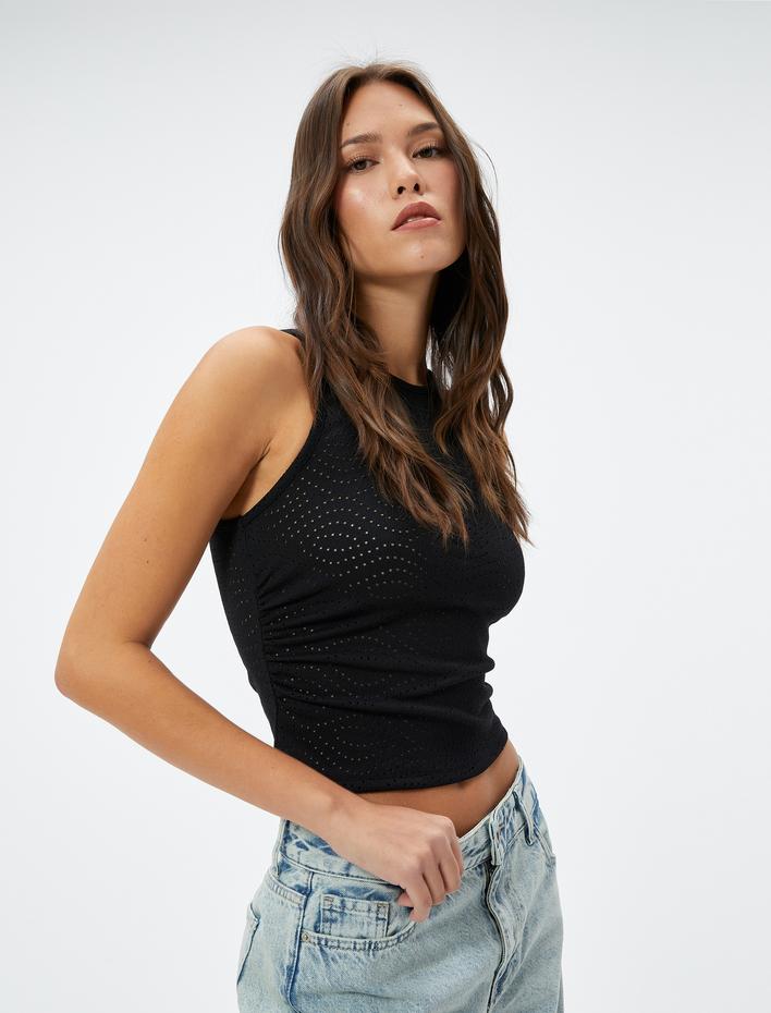 Ajurlu Crop Tişört Kısa Kollu Bisiklet Yaka