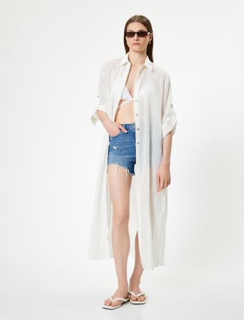 Çizgili Uzun Gömlek Elbise Kıvrımlı 3/4 Kol Dokulu Viskoz Kumaş