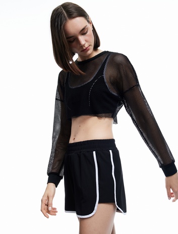 Uzun Kollu Tişört File Crop Bisiklet Yaka Ajurlu