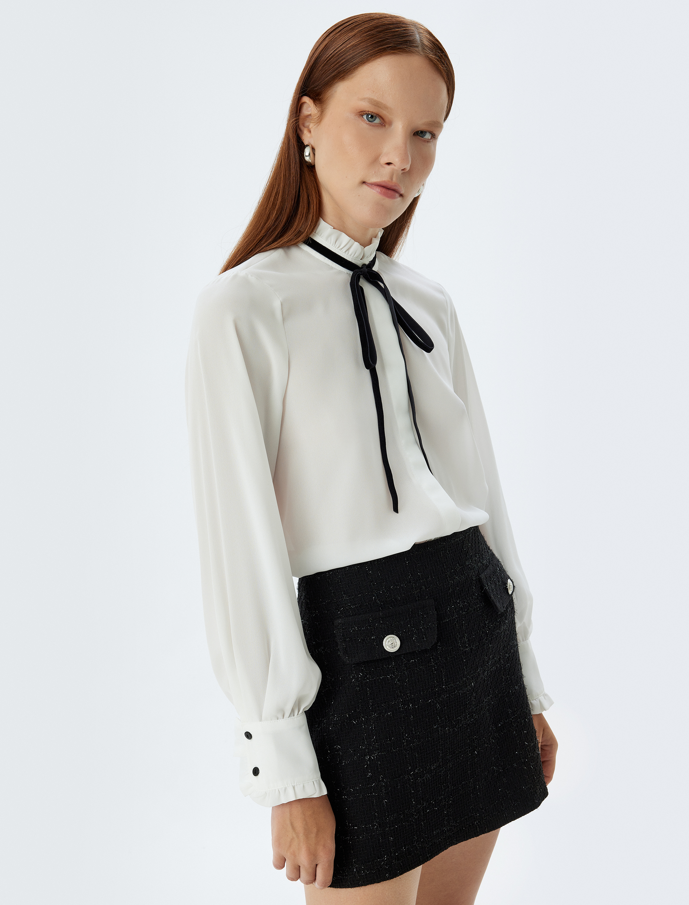 Fırfırlı Dik Yaka Gömlek Fiyonk Bağlama Detaylı Krep Kumaş