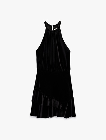 Slim Fit Kolsuz Fırfırlı Halter Yaka Kadife Mini Elbise Sepete Ekle