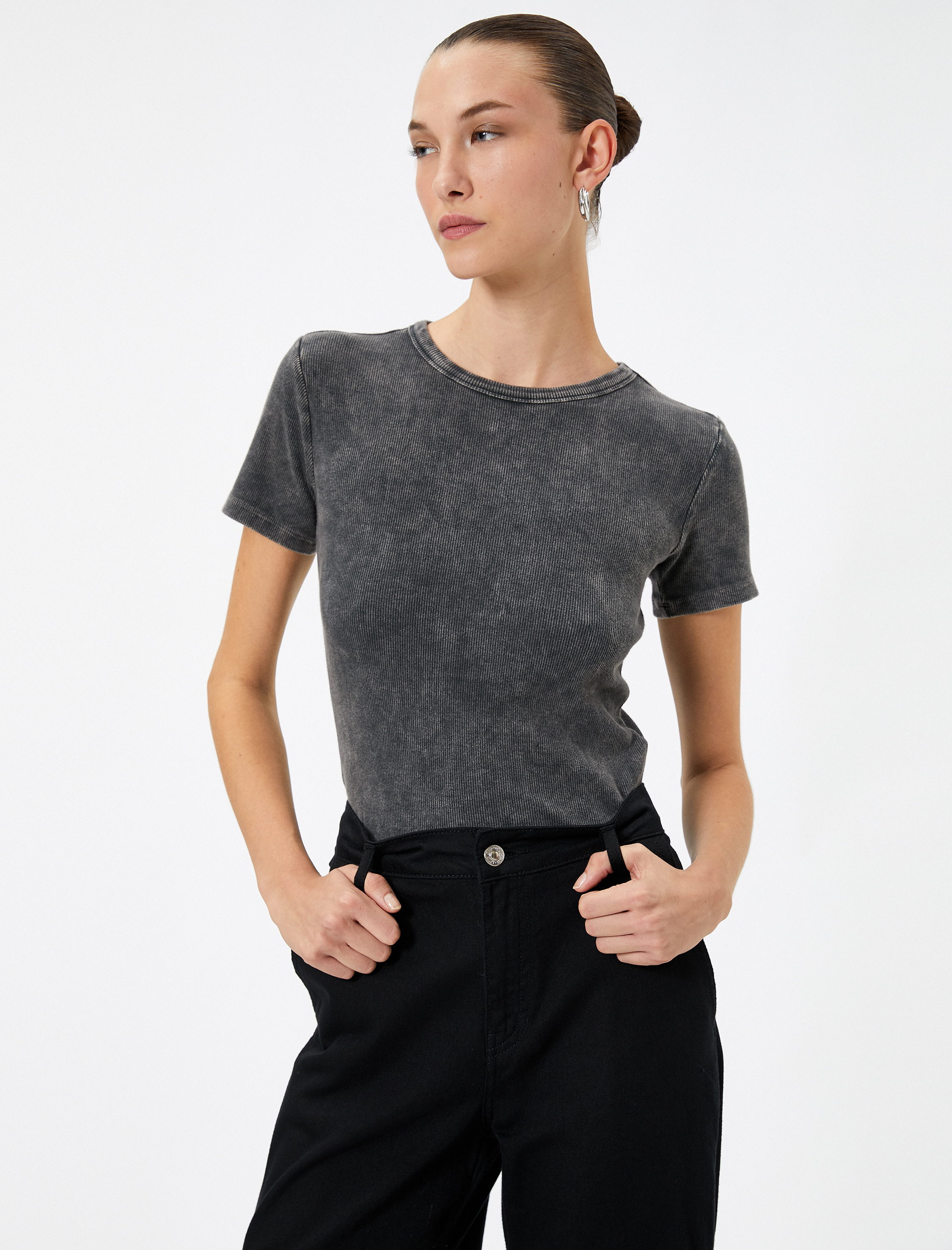 Fitilli Tişört Yıkamalı Kısa Kollu Bisiklet Yaka Pamuklu