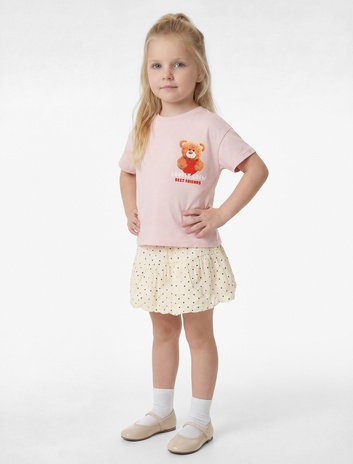 Kız Bebek Pamuklu Kısa Kollu Bisiklet Yaka Kalpli Ayıcık Baskılı Tişört