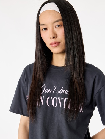 Rahat Kalıp Kısa Kollu Bisiklet Yaka Arkası Baskılı Fiyonklu Tişört
