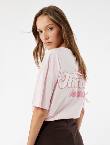Rahat Kalıp Kısa Kollu Pamuklu Bisiklet Yaka Fiyonklu Arkası Baskılı Tişört Sepete Ekle