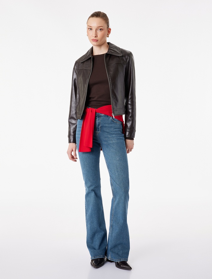 Suni Deri Cep Detaylı Fermuarlı Uzun Kollu Dik Yaka Crop Ceket