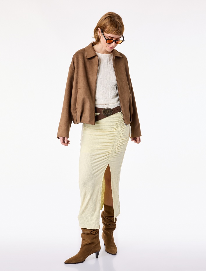 Slim Fit Bürümcük Kumaş Drape Detaylı Midi Boy Kalem Etek Sepete Ekle