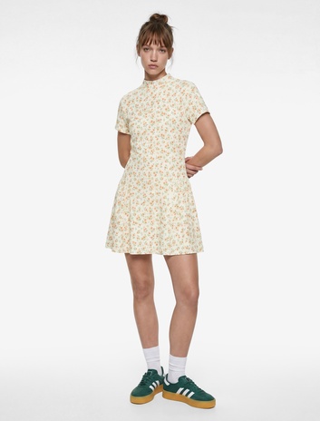 Mini Kısa Kollu Dik Yaka Çiçekli Kloş Elbise