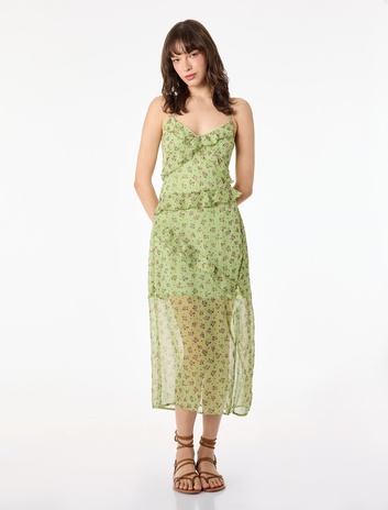 V Yaka Çapraz Askılı Fırfırlı A Kesim Yırtmaçlı Tül Uzun Çiçekli Elbise