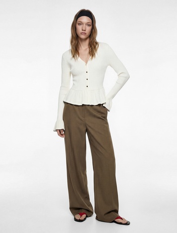 Düğmeli Uzun Kollu V Yaka Pamuklu Volanlı Triko Peplum Hırka