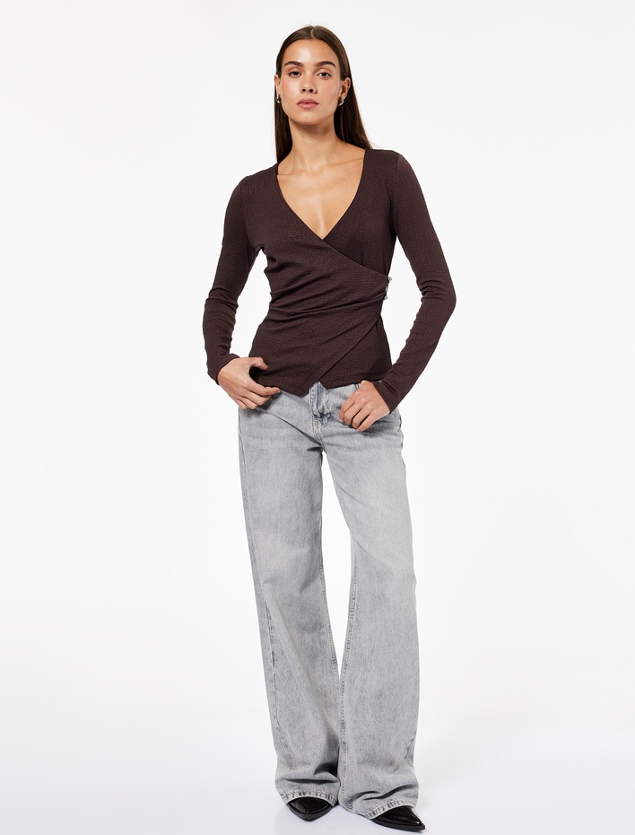 Metal Aksesuarlı Uzun Kollu Slim Fit Bürümcük Kruvaze Yaka Bluz