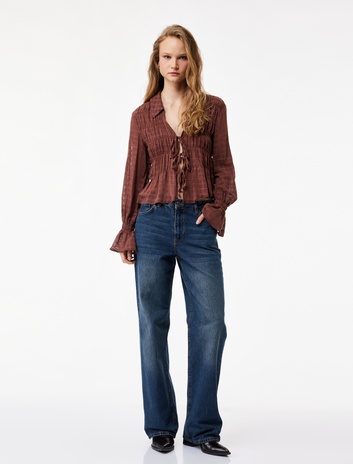 Slim Fit Bürümcük Uzun Kollu V Yaka Bağlama Detaylı Bluz
