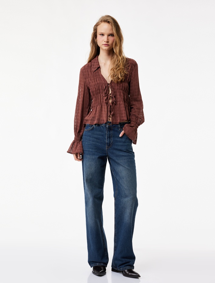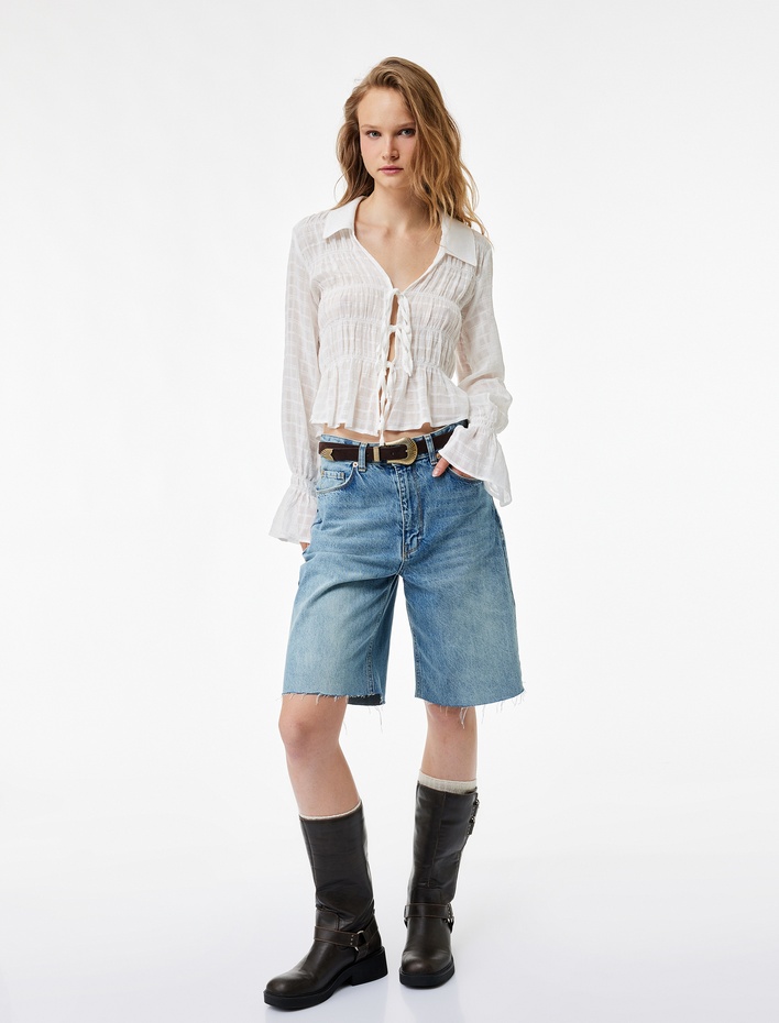 Uzun Fırfırlı Kol Gömlek Yaka Fiyonklu Bağlama Detaylı Bluz