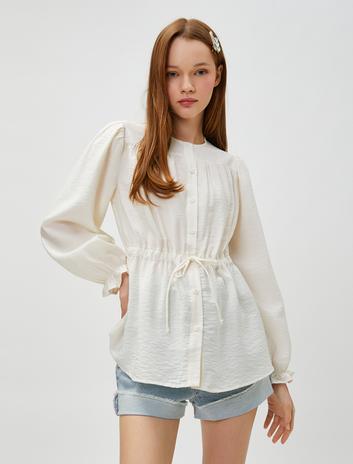 Balon Kollu Bluz Düğmeli Beli Bağlamalı Bisiklet Yaka
