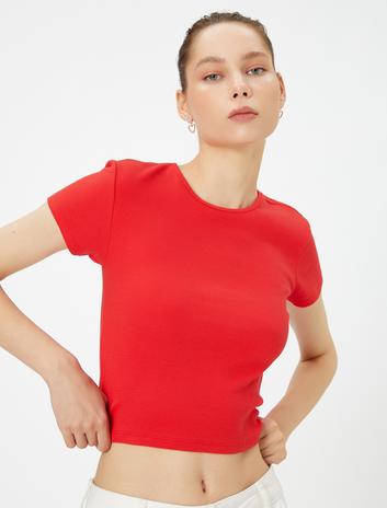 Crop Tişört Kısa Kollu Bisiklet Yaka Dokulu
