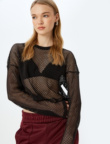 Kroşe Crop Tişört Uzun Kollu Yuvarlak Yaka Ajurlu