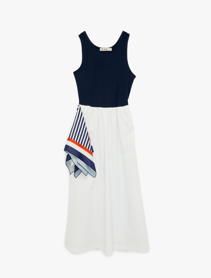 Pamuklu Kolsuz Fular Detaylı Bisiklet Yaka Uzun Elbise Sepete Ekle