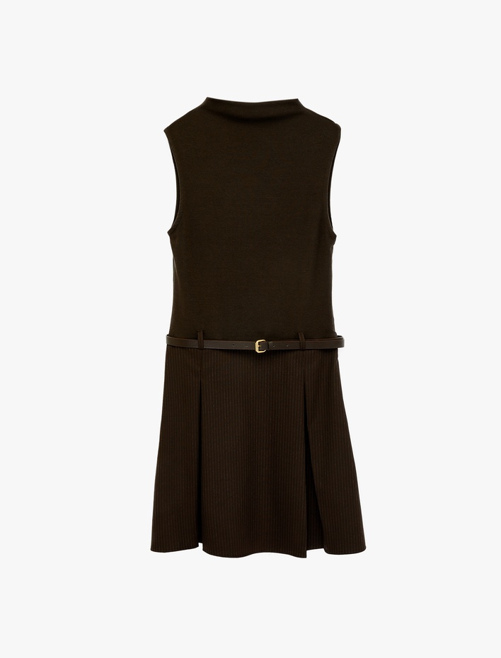 Mini Jile Elbise Pileli Kolsuz U Yaka Kemer Detaylı Slim Fit