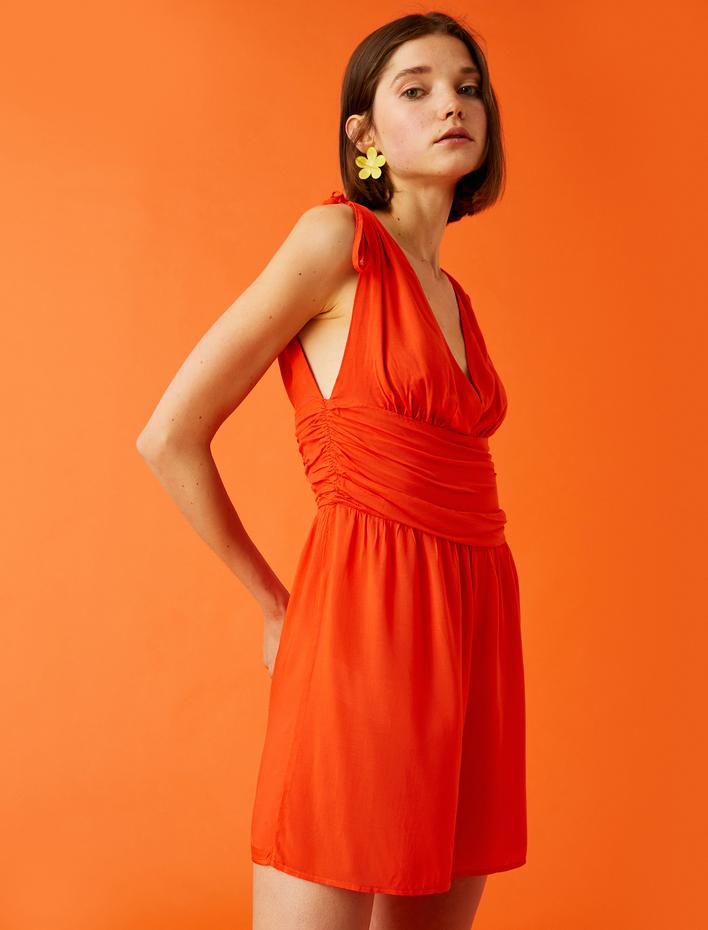 Şort Tulum Kolsuz V Yaka Bel Detaylı Keten Karışımlı Sepete Ekle
