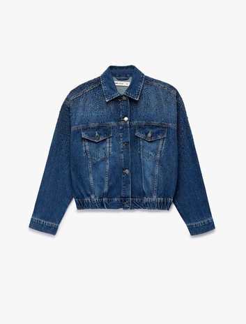 Uzun Kollu Klasik Yaka Düğmeli Cepli Taş Detaylı Denim Ceket