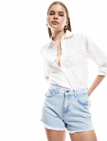 Dantel Detaylı Düğmeli Klasik Yaka Uzun Kollu Keten Karışımlı Gömlek