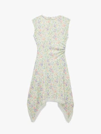 Kolsuz Dantel Detaylı Asimetrik Kesim Bisiklet Yaka Çiçekli Elbise Sepete Ekle