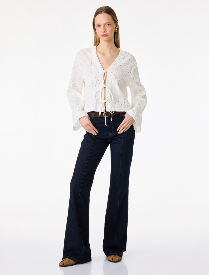 Pamuklu Uzun Kollu V Yaka Bağlamalı Fiyonk Detaylı Bluz Sepete Ekle