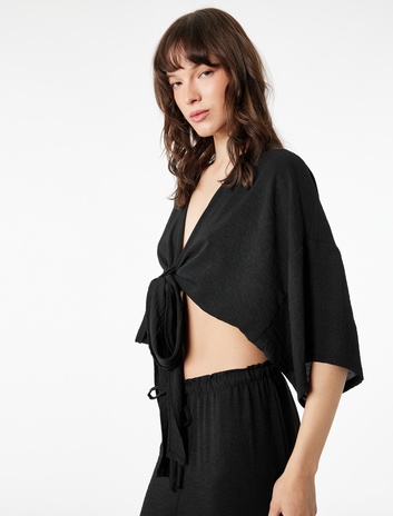 Kısa Kollu Kruvaze Yaka Bağlamalı Crop Oversize Kimono