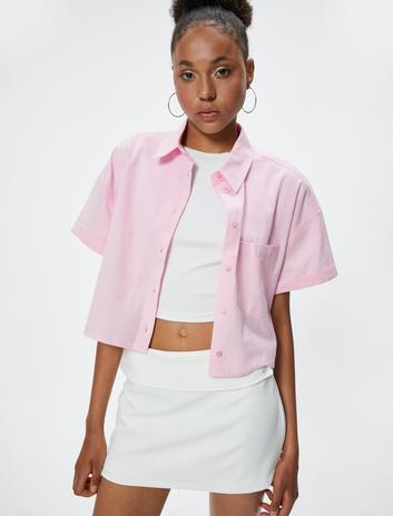 Crop Keten Gömlek Dirsek Boy Kısa Kollu Cepli Rahat Kalıp